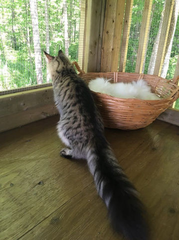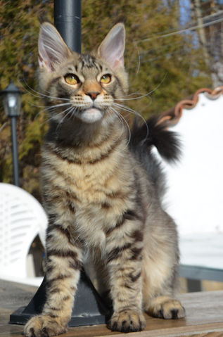 Cimona is a fifth generation Maine Coon, with a nicely outcrossed pedigree. Our Hazel is Cimona’s grandma. Moose is her great grandpa. Tigger is her great great great grandpa! I am thrilled about her great boning and large frame, her lovely coat and pattern and look at those gorgeous eyes! Cimona has perfect oral health. She is my pride and joy!